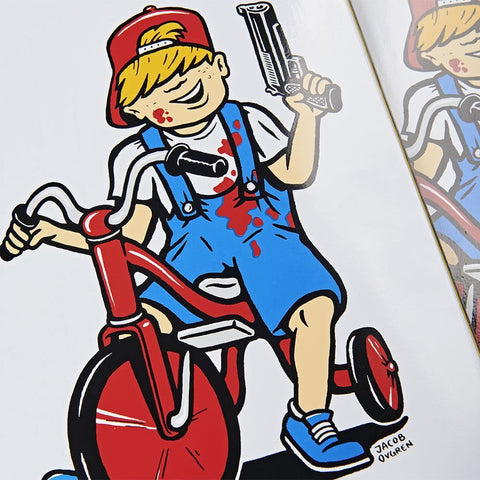 Polar 'Oskar Rozenberg Tricycle' 8.25" white deck featuring artwork by Jacob Ovgren. Nick Boserio signature model. Manufactured by BBS. Made in Mexico.