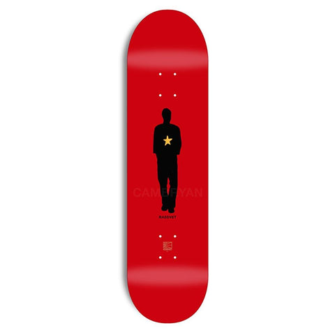 Rassvet 'Cambryan Sedlick Gerry' 8.5" red deck featuring a Cambryan silhouette against red. Cambryan Sedlick pro board. Made in Mexico by BBS Manufacturing.